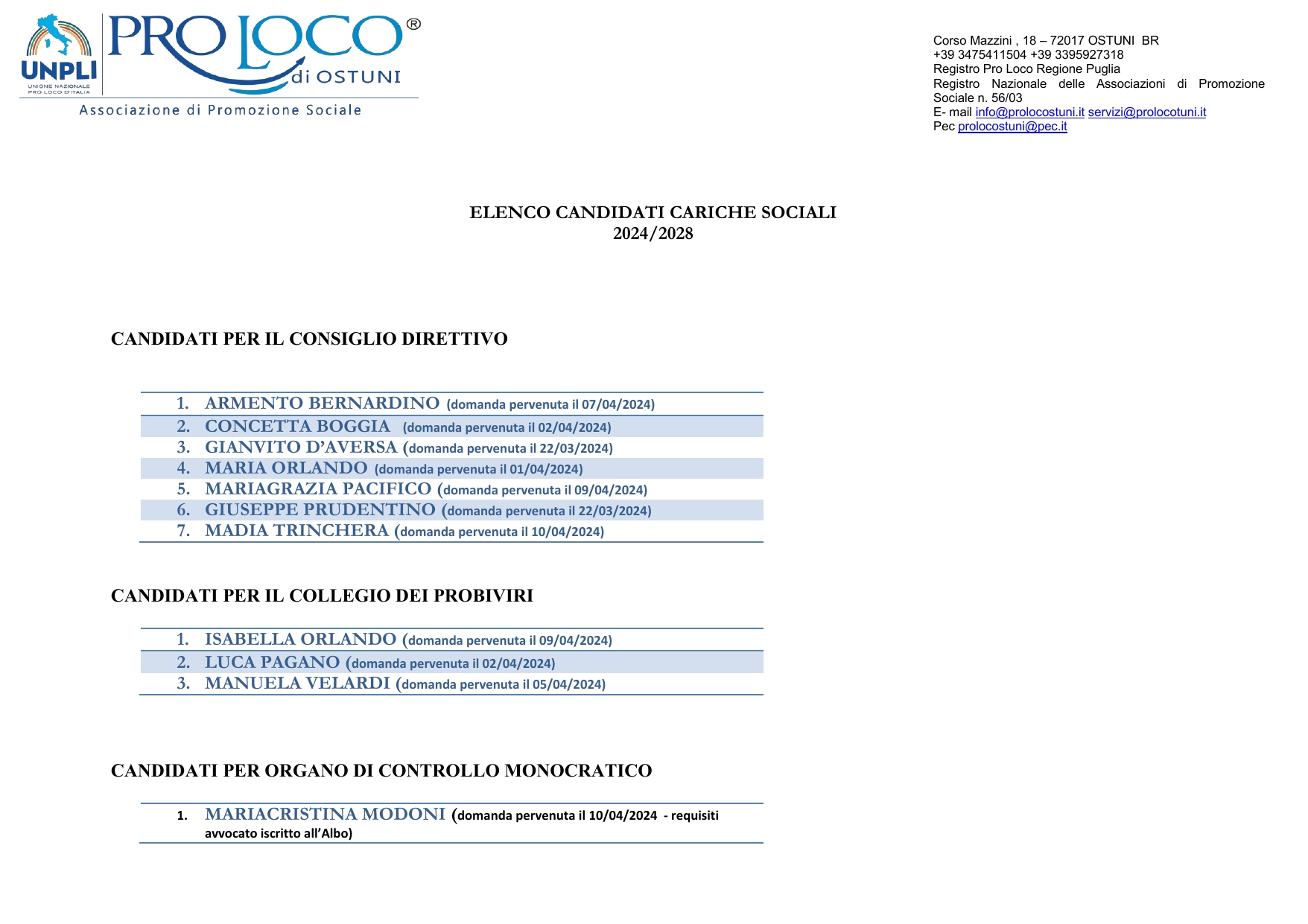I Soci dell’Associazione di Promozione Sociale Pro Loco di Ostuni, sono comvocati in Assemblea Ordinaria Eelettiva sabato 20 aprile 2024 alle ore 16.00 in prima convocazione ed occorrendo in seconda convocazione alle ore 17.00 – presso la sede sociale per discutere e deliberare il seguente Ordine del Giorno: